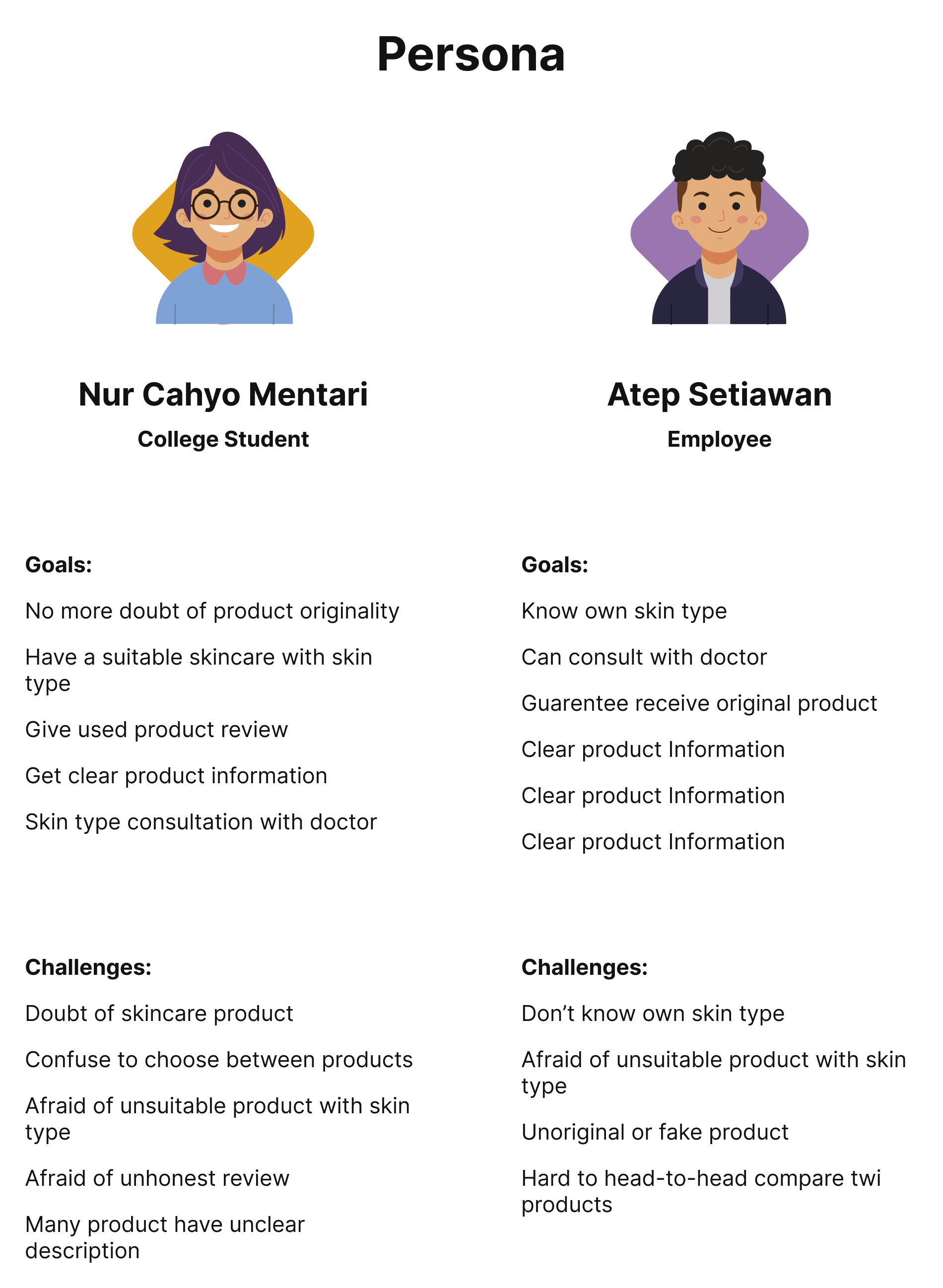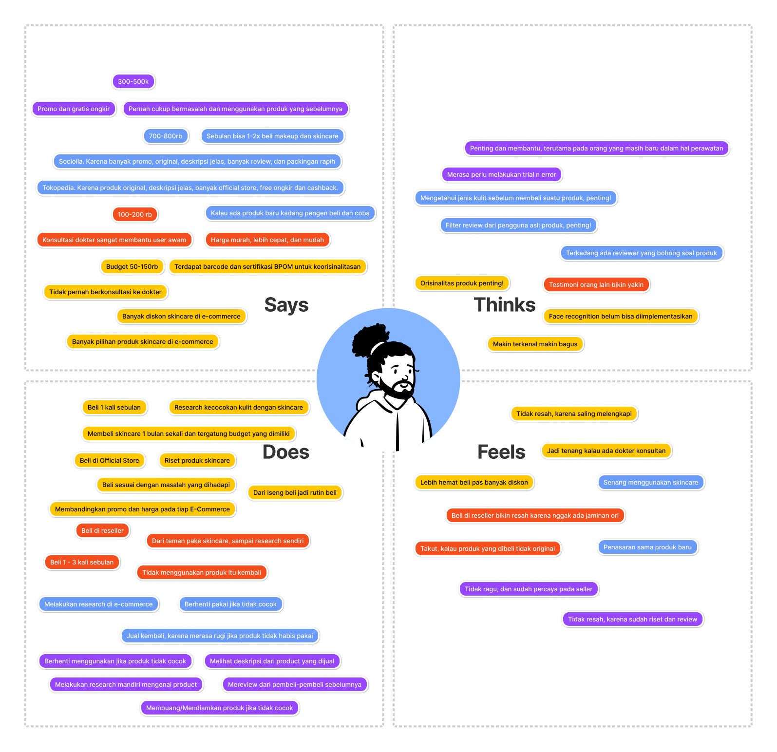 Based on the hypothetical problem, we drafted a couple of questions and casually asked selected people whether they had any pain when shopping for makeup or skincare in the marketplace. Our hypothesis is that users tend to worry about product originality, but on the other hand, users want to get the best deal.
